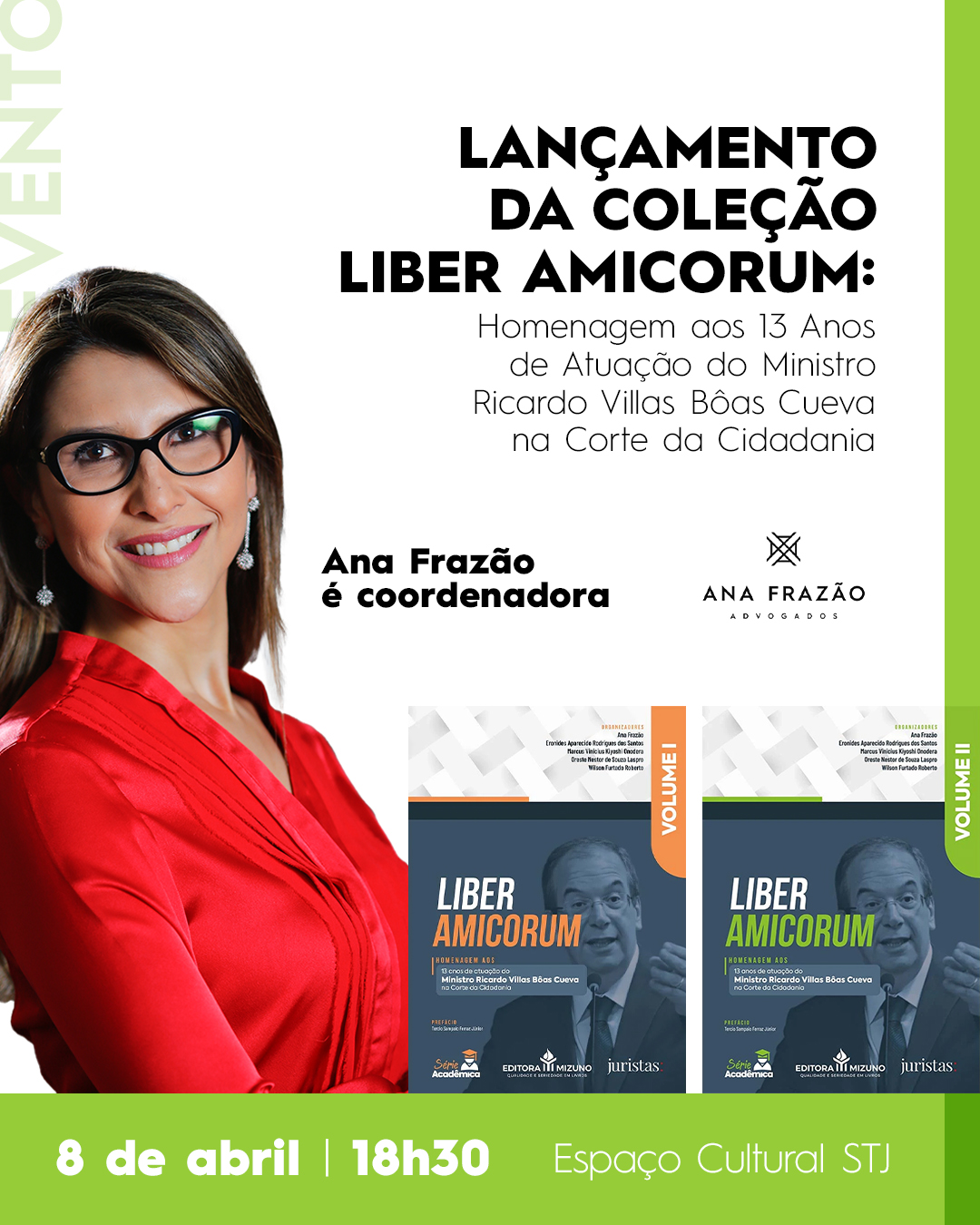 No próximo dia 8 de abril, acontece o lançamento da coleção “Liber Amicorum: Homenagem aos 13 Anos de Atuação do Ministro Ricardo Villas Bôas Cueva na Corte da Cidadania”, publicada pela editora Mizuno, e da qual nossa sócia Ana Frazão é coordenadora e coautora.