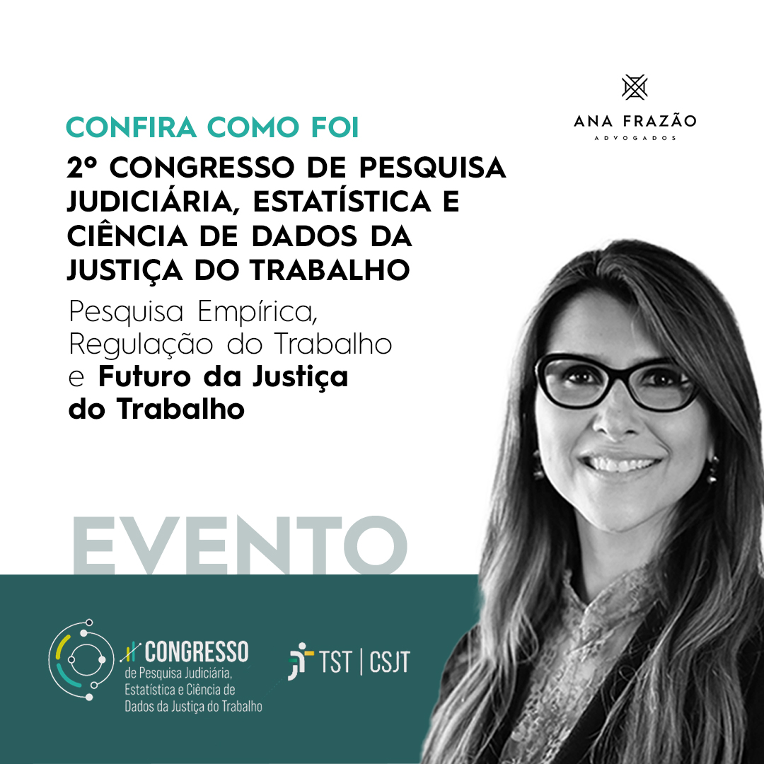 No último dia 20 de agosto, nossa sócia Ana Frazão participou do 2º Congresso de Pesquisa Judiciária, Estatística e Ciência de Dados da Justiça do Trabalho, promovido pela Secretaria de Pesquisa Judiciária e Ciência de Dados do TST, em parceria com a Escola Nacional de Formação e Aperfeiçoamento de Magistrados do Trabalho (Enamat) e com o Conselho Superior da Justiça do Trabalho (CSJT).