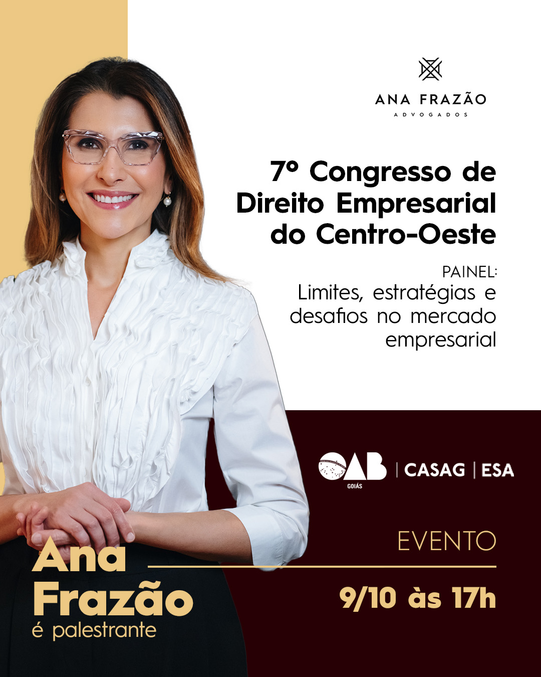 No dia 9/10, nossa sócia Ana Frazão participa do 7º Congresso de Direito Empresarial do Centro-Oeste, promovido pela Ordem dos Advogados do Brasil Seção Goiás (OAB-GO) e pela Escola Superior de Advocacia da OAB Seção Goiás.