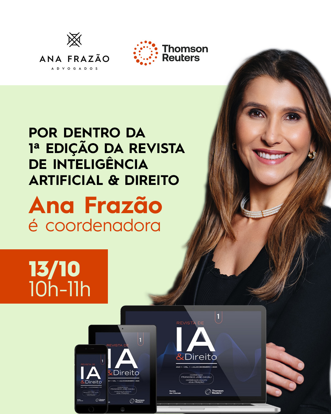 No dia 13/10, nossa sócia Ana Frazão participa do webinar “Quando a IA encontra o Direito: por dentro da RIAD”, evento de lançamento da 1ª edição da Revista de Inteligência Artificial & Direito (RIAD), realizado pela editora Thomson Reuters.