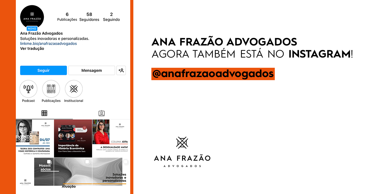 É com satisfação que comunicamos que Ana Frazão Advogados agora tem um novo canal de comunicação: o nosso perfil @anafrazaoadvogados no Instagram!