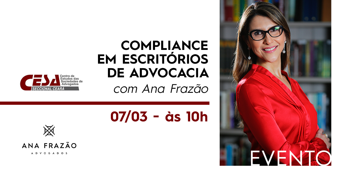 Na próxima segunda-feira, 07/03, às 10h, nossa sócia Ana Frazão debate o “Compliance em escritórios de advocacia”, em encontro virtual promovido pelo CESA – Centro de Estudos das Sociedades de Advogados, seccional Ceará.