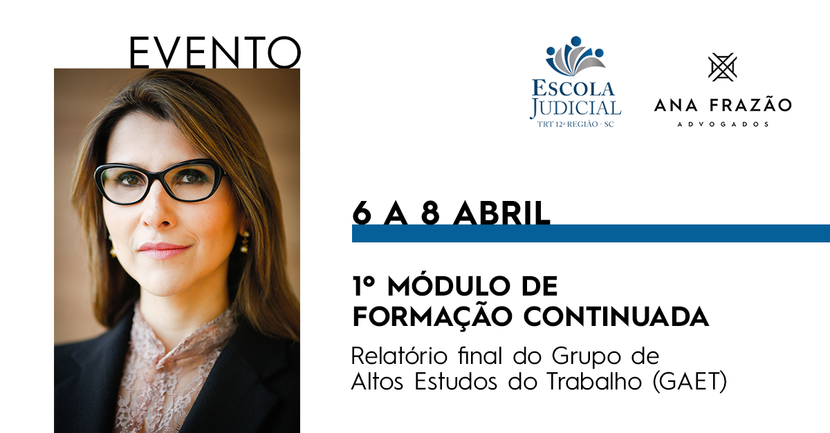 Nossa sócia Ana Frazão fará parte da equipe de magistrados, professores e economistas que farão a análise do relatório final do Grupo de Altos Estudos do Trabalho (Gaet), criado pelo Governo Federal, durante o 1º Módulo de Formação Continuada promovido pela Escola Judicial (Ejud) – TRT 12ª região – SC.
