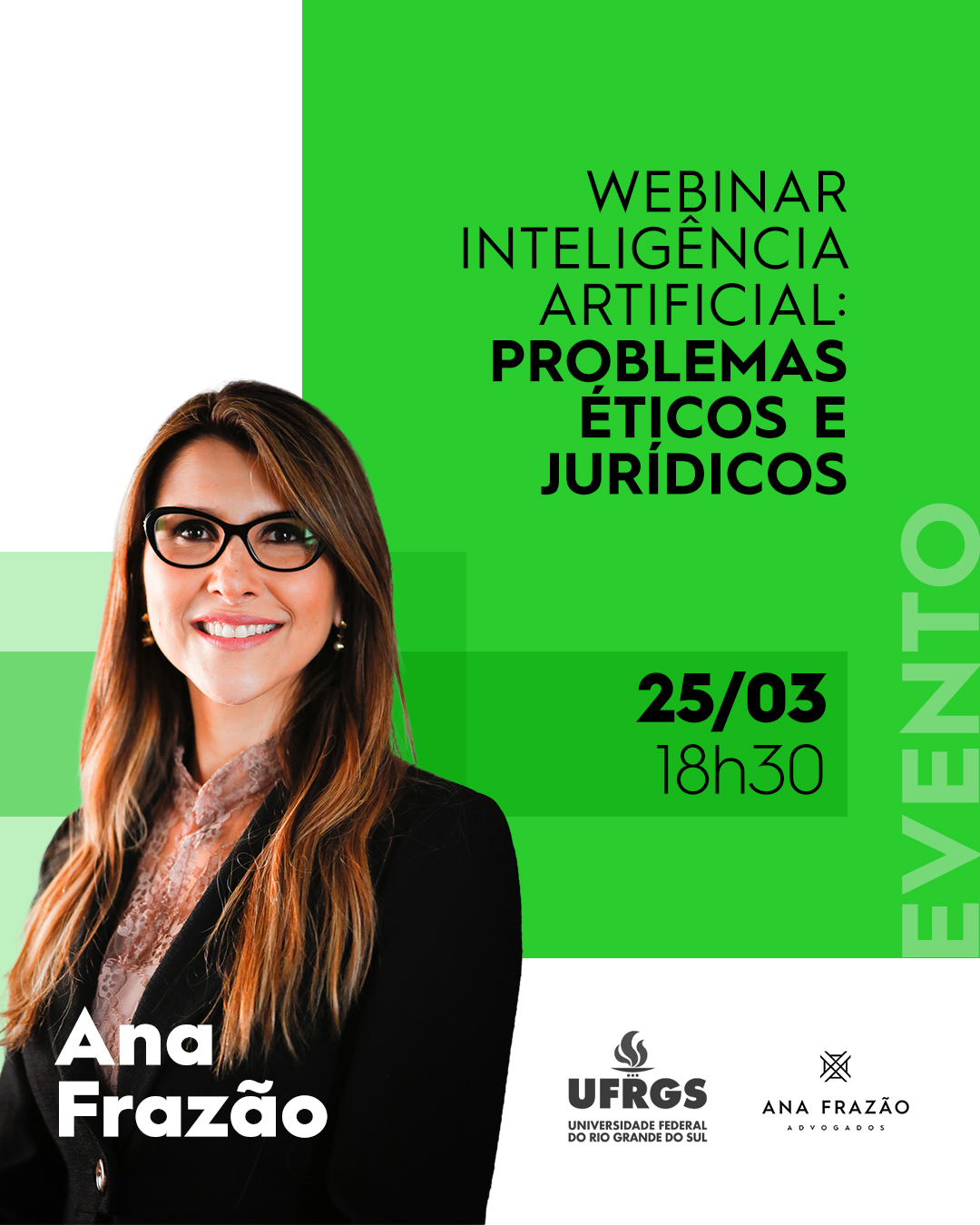 No próximo dia 25/3, às 18h30, nossa sócia Ana Frazão participa do webinar “Inteligência Artificial: Problemas Éticos e Jurídicos”, promovido pela Faculdade de Direito da Universidade Federal do Rio Grande do Sul (UFRGS).