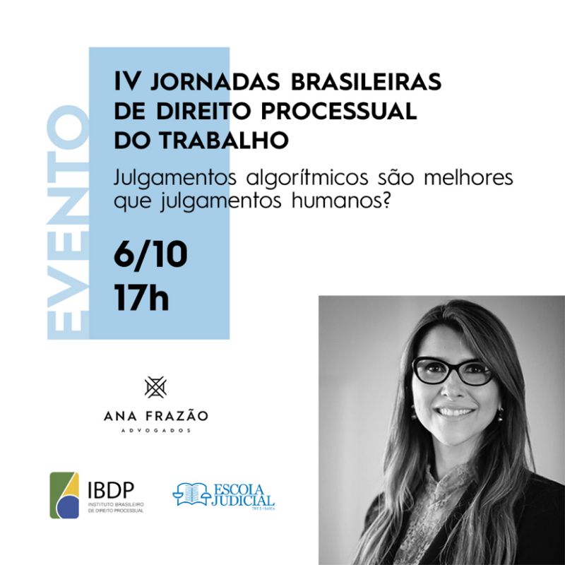 Nos dias 6 e 7 de outubro, o Instituto Brasileiro de Direito Processual (IBDP), junto com a Escola Judicial do TRT-2 (Ejud-2), promoverá o “IV Jornadas Brasileiras de Direito Processual do Trabalho”, do qual nossa sócia Ana Frazão será palestrante.