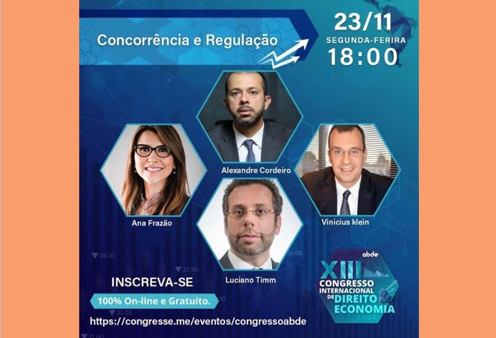 O XIII Congresso Internacional de Direito e Economia conta com a participação da nossa sócia Ana Frazão em debate sobre “Concorrência e Regulação”, realizado hoje (23), às 18h, em transmissão online e gratuita. Ao lado de Ana estarão Alexandre Cordeiro Macedo (Conselho Administrativo de Defesa Econômica), Vinicius Klein (UFPR) e Luciano Benetti Timm (FGV DIREITO SP).