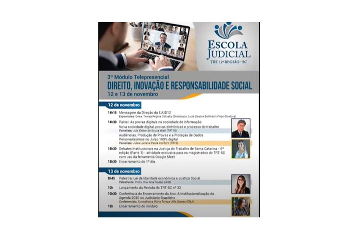 Palestrando sobre “A necessária vinculação entre a liberdade de iniciativa e a Justiça Social”, no último dia 13, em módulo promovido pela Escola Judicial do Tribunal Regional do Trabalho da 12ª Região (TRT-SC):