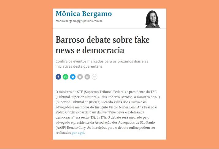 A coluna da Mônica Bergamo na Folha de S.Paulo destacou o evento “Fake news e a defesa da democracia”, que acontece hoje, às 17h, com participação da nossa sócia Ana Frazão.
