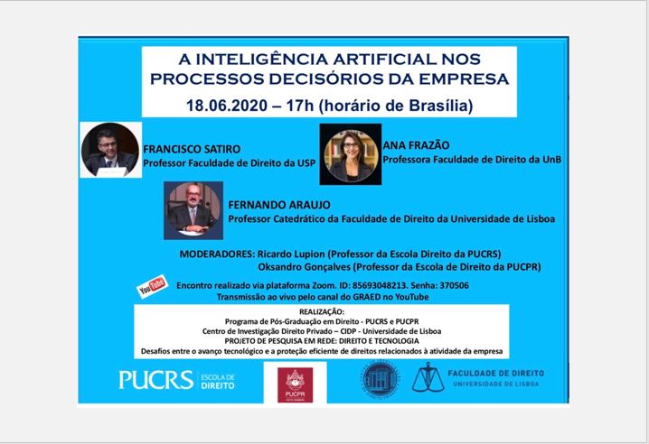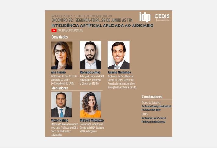 Nossa sócia Ana Frazão participa hoje às 17h de debate sobre inteligência artificial aplicada ao Judiciário, em webinar promovido pelo Instituto Brasiliense de Direito Público (IDP), dentro do grupo de estudos “O Direito em tempos de Covid-19”.
