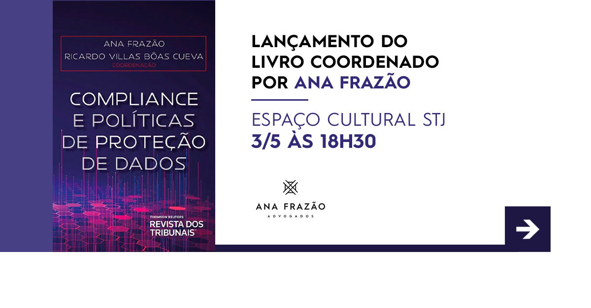 No próximo dia 3/5, a partir das 18h30, acontecerá o lançamento do livro “Compliance e políticas de proteção de dados”, da Editora Revista dos Tribunais (Thomson Reuters), coordenado por nossa sócia Ana Frazão e pelo ministro do Superior Tribunal de Justiça (STJ) Ricardo Villas Bôas Cueva.