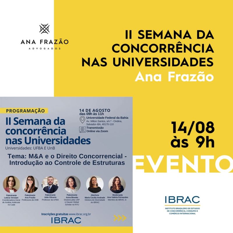 No próximo dia 14 de agosto, às 9h, nossa sócia Ana Frazão participará do evento “II Semana da Concorrência nas Universidades”, realizado pelo IBRAC – Instituto Brasileiro de Estudos de Concorrência, Consumo e Comércio Internacional e que acontece na Universidade Federal da Bahia (UFBA).