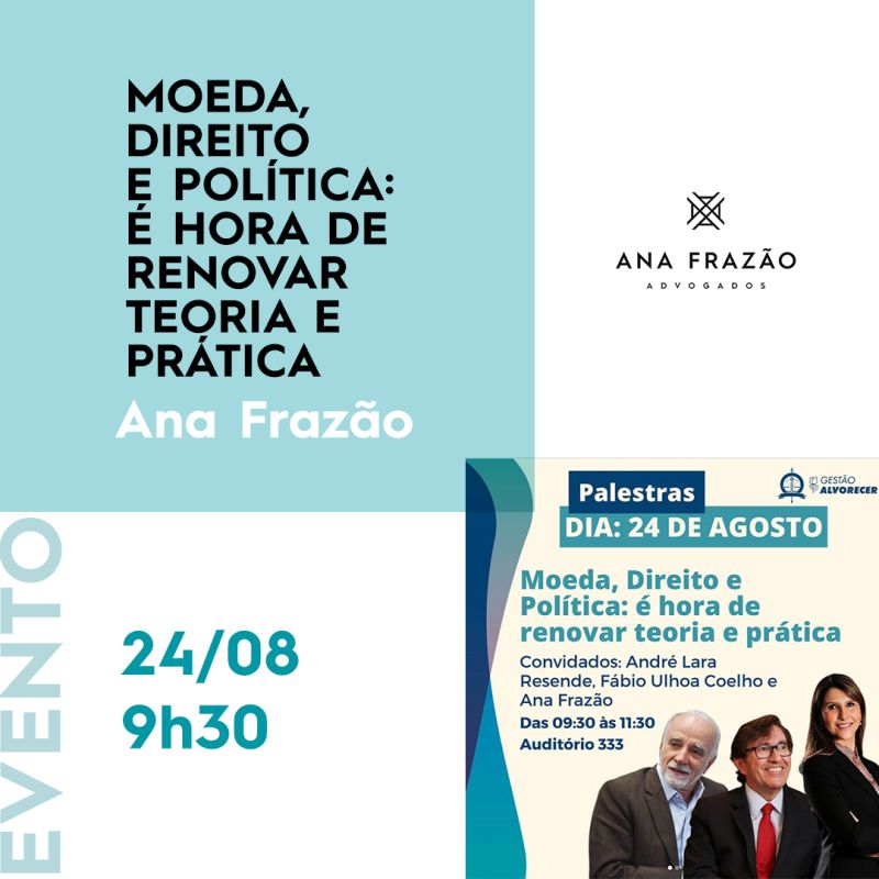 No último dia 24 de agosto, nossa sócia Ana Frazão participou ao lado de André Lara Resende e Fabio Ulhoa Coelho, do ciclo de palestras realizadas pelo Centro Acadêmico 22 de Agosto da faculdade de Direito da PUC-SP. O tema do debate foi “Moeda, Direito e Política: é hora de renovar teoria e prática”.