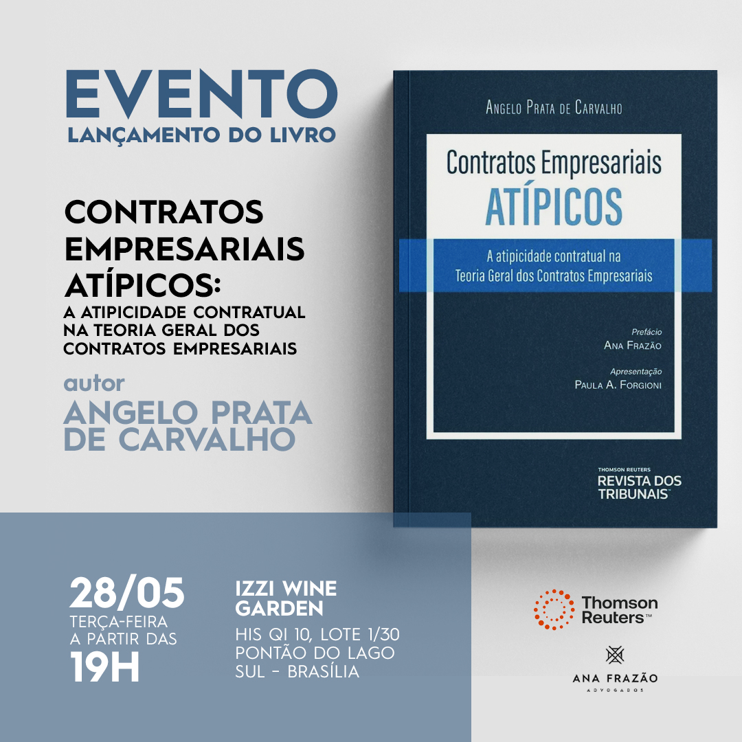 No próximo dia 13 de junho, nosso sócio Angelo Prata de Carvalho lança seu livro “Contratos empresariais atípicos: a atipicidade contratual na teoria geral dos contratos empresariais”, da editora Revista dos Tribunais, em São Paulo (SP).