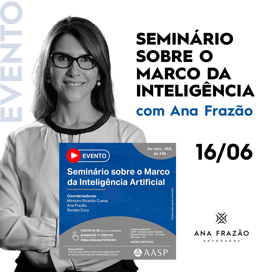 No dia 16 de junho, às 14h, acontecerá o “Seminário sobre o Marco da Inteligência Artificial”, do qual nossa sócia Ana Frazão é coordenadora ao lado de Ricardo Villas Bôas Cueva, ministro do Superior Tribunal de Justiça (STJ), e de Ricardo Cury.